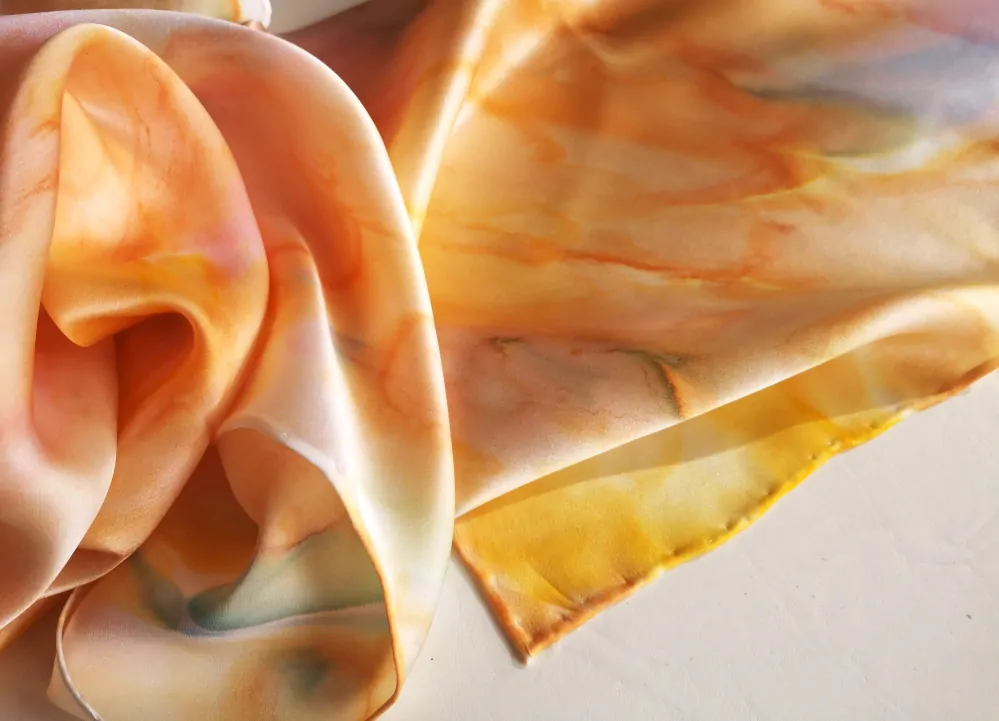 Jsou použity profesionální barvy na hedvábí Dye-na-flow od společnsoti Jacquard. Jsou zažehleny a při praní nepouštějí. Barvy jsou zažehleny a šála je vypraná. Můžete ihned nosit.