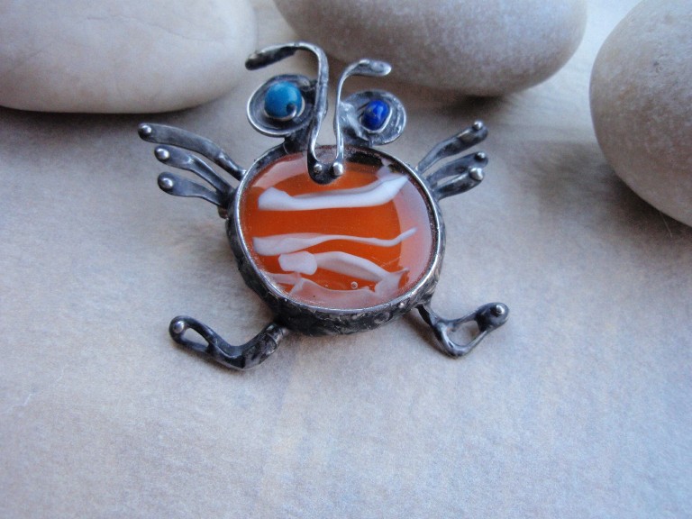 Autorská brož vyrobená Tiffany technikou z cínovaných drátků a ručně tavenéh skla. Použitý skleněný kabšon jasné oranžové barvy.
