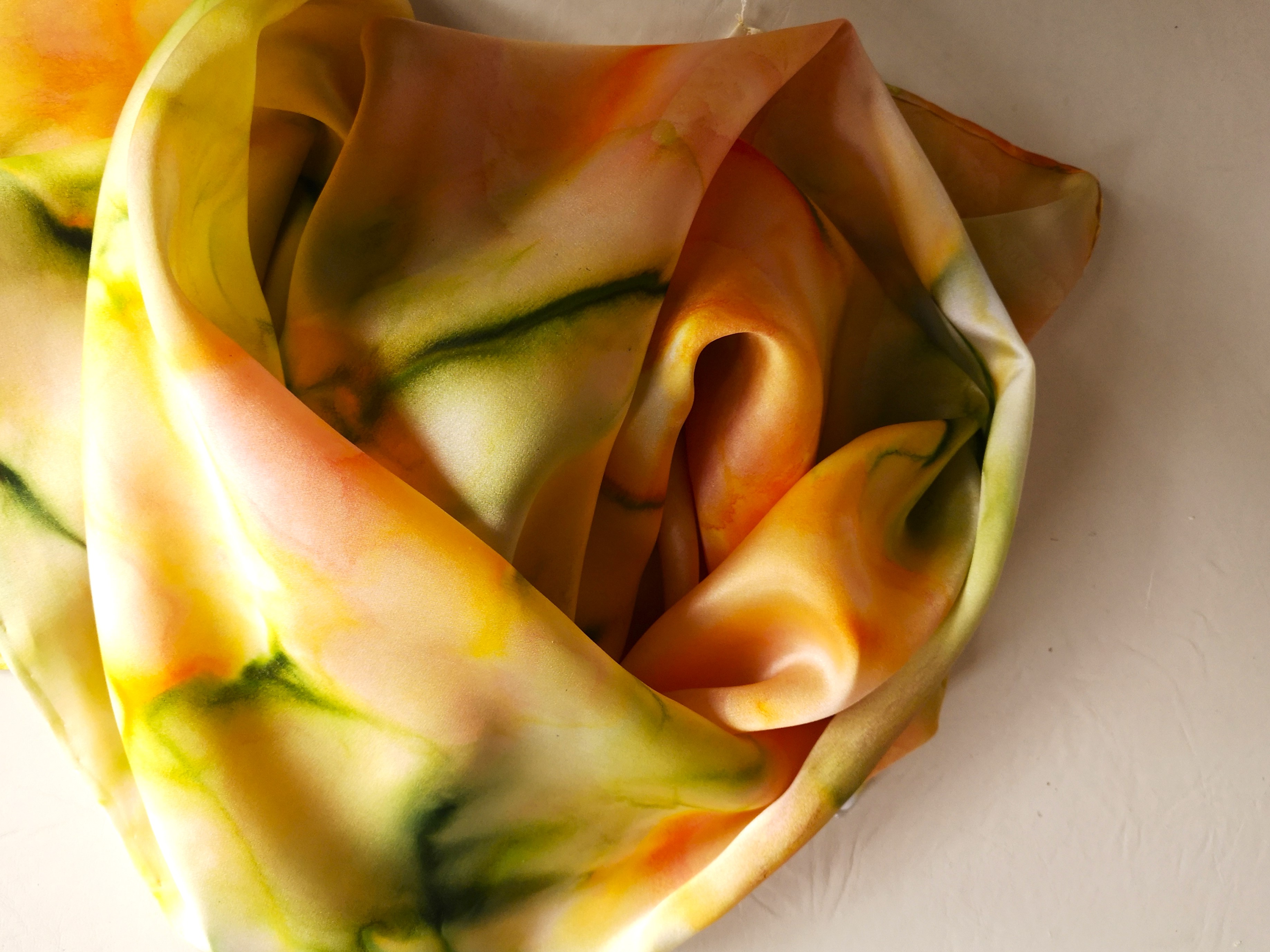 Jsou použity profesionální barvy na hedvábí Dye-na-flow od společnsoti Jacquard a kontury a barvy Marabu. Jsou zažehleny a při praní nepouštějí. Barvy jsou zažehleny a šála je vypraná. Můžete ihned nosit.