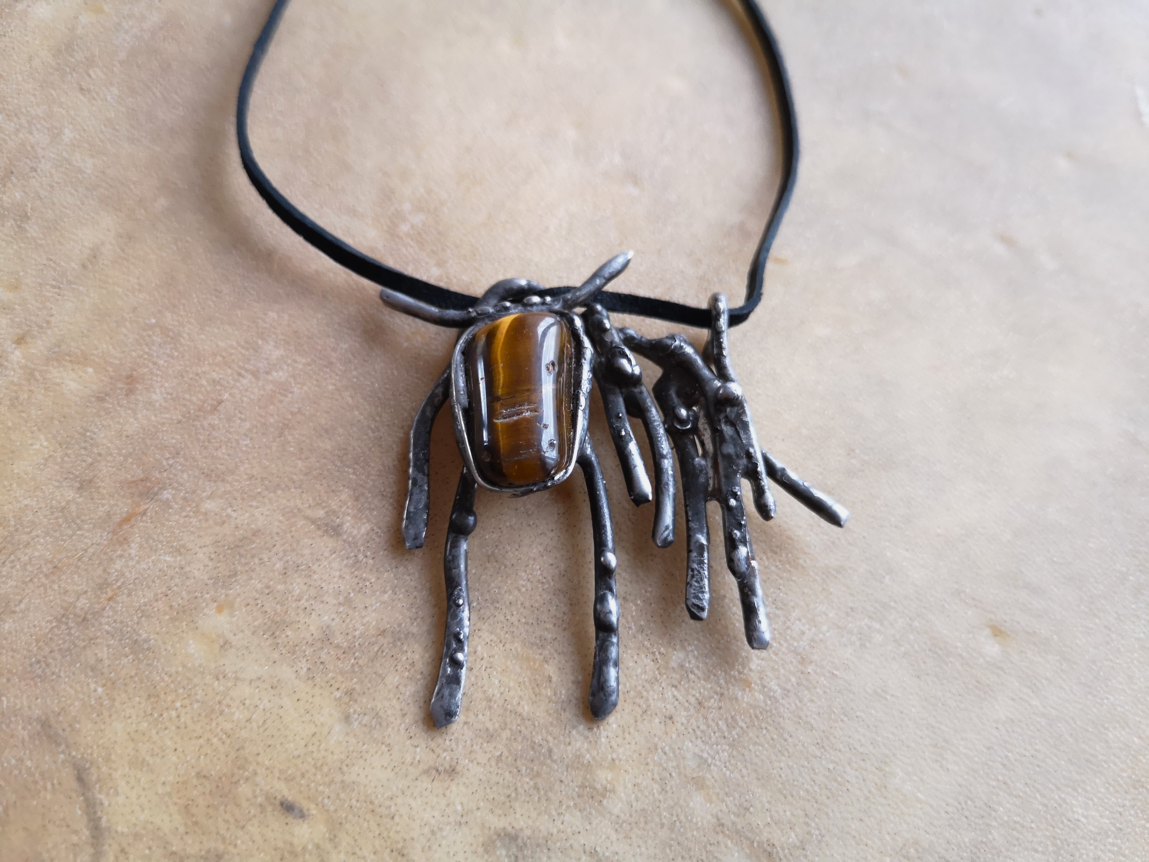 Autorský přívěšek vyrobený z polodrahokamu tygří oko a cínovaných, tepaných drátků. Šperk je inspirován siluetou býčka se skloněnou hlavou. Takže vhodný dárek pro zrozence v býku.