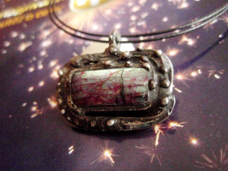 Vitrážový šperk s labradoritem. Kousek vyvřelého srdce země lapeného do kovu. Cínováno, patinováno, leštěno. Přívěšek je zavěšen na černém lanku zakončeném šroubovým uzávěrem. Do balíčku přikládám také závěs z bužírky s karabinkou a řetízkem. Můžete si závěsy střídat podle libosti. Šperk je zasílán v dárkové krabičce.