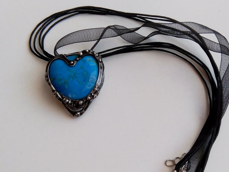 Srdíčko je vyrobeno technikou Tiffany. Vloženým kamenem je tyrkys. Zavěšeno na organzových šňůrkách s karabinkou a řetízkem pro nastavení délky. Zdoben cínem, patinován a leštěn.