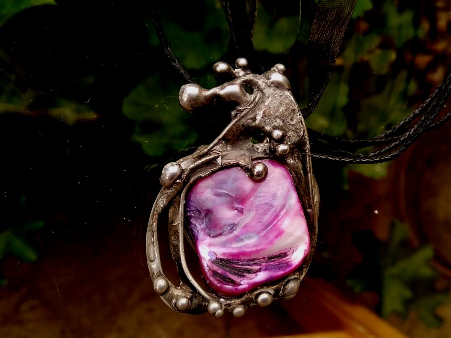 Šperk vyrobený technikou Tiffany z cínu a barvené perleti.
