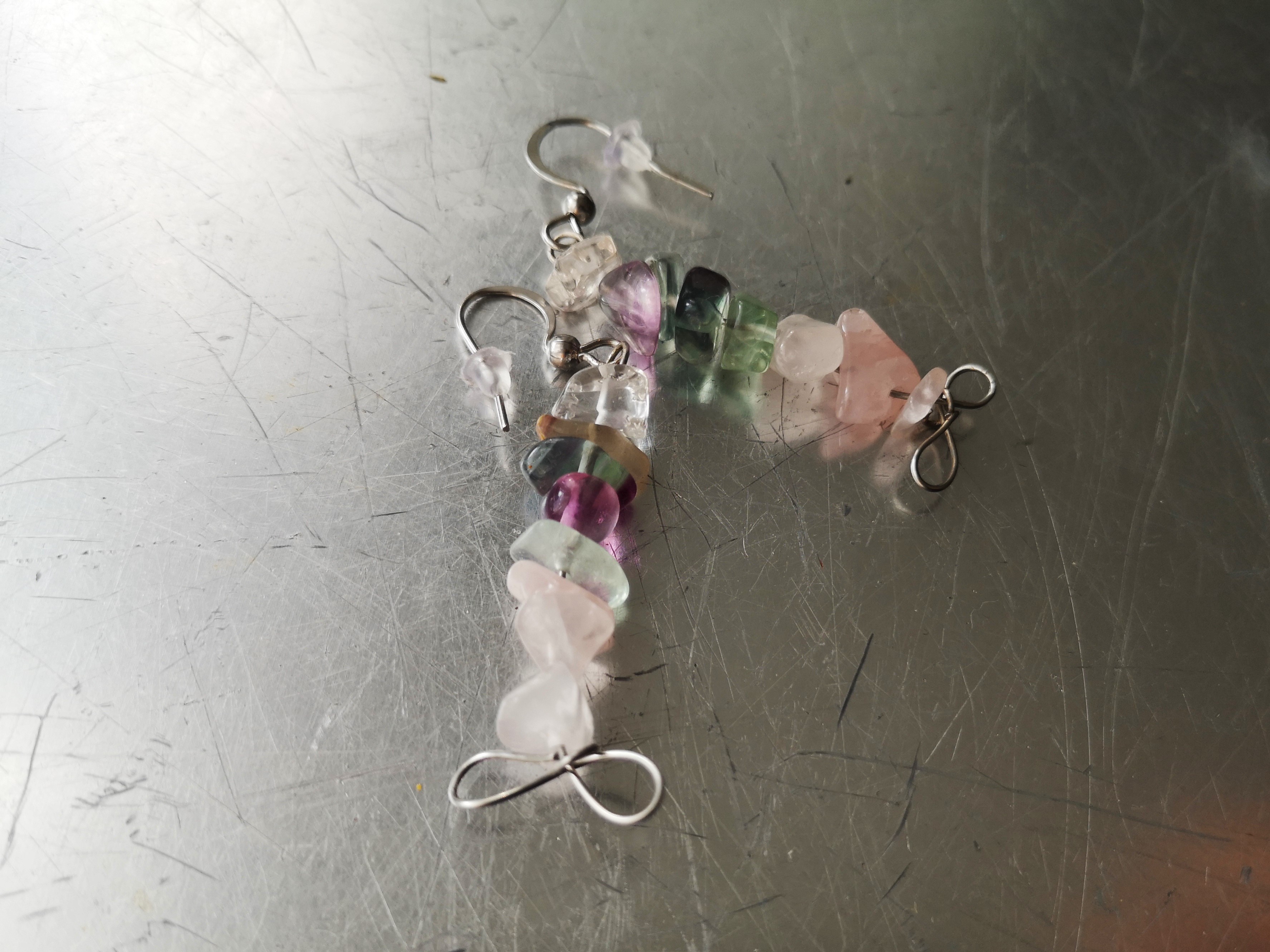 Náušničky jsou celé tepané z chirurgické oceli, vhodné i pro alergiky. Zdobené jsou úlomky z křišťálu, fluoritu a růženínu.