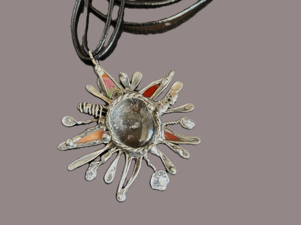 Autorský vitrážový šperk. Použitý minerál je křišťál s vrostlým turmalínem. Dále byly použity kousky červeného skla a trmolované křišťály. Na dvojitý závěs na krk byly použity voskované šňůry.