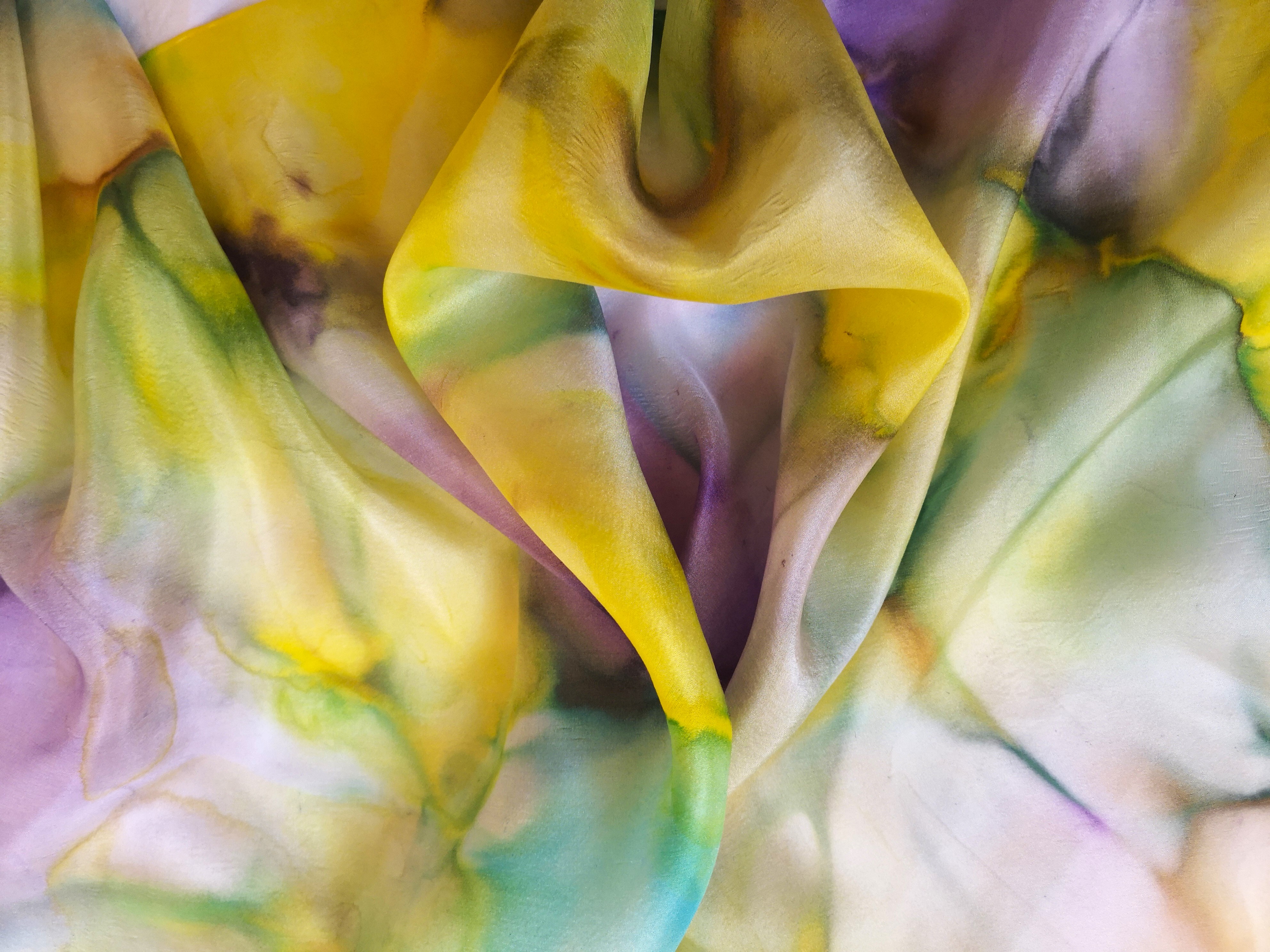 Jsou použity profesionální barvy na hedvábí Dye-na-flow od společnsoti Jacquard. Jsou zažehleny a při praní nepouštějí. Barvy jsou zažehleny a šála je vypraná. Můžete ihned nosit.