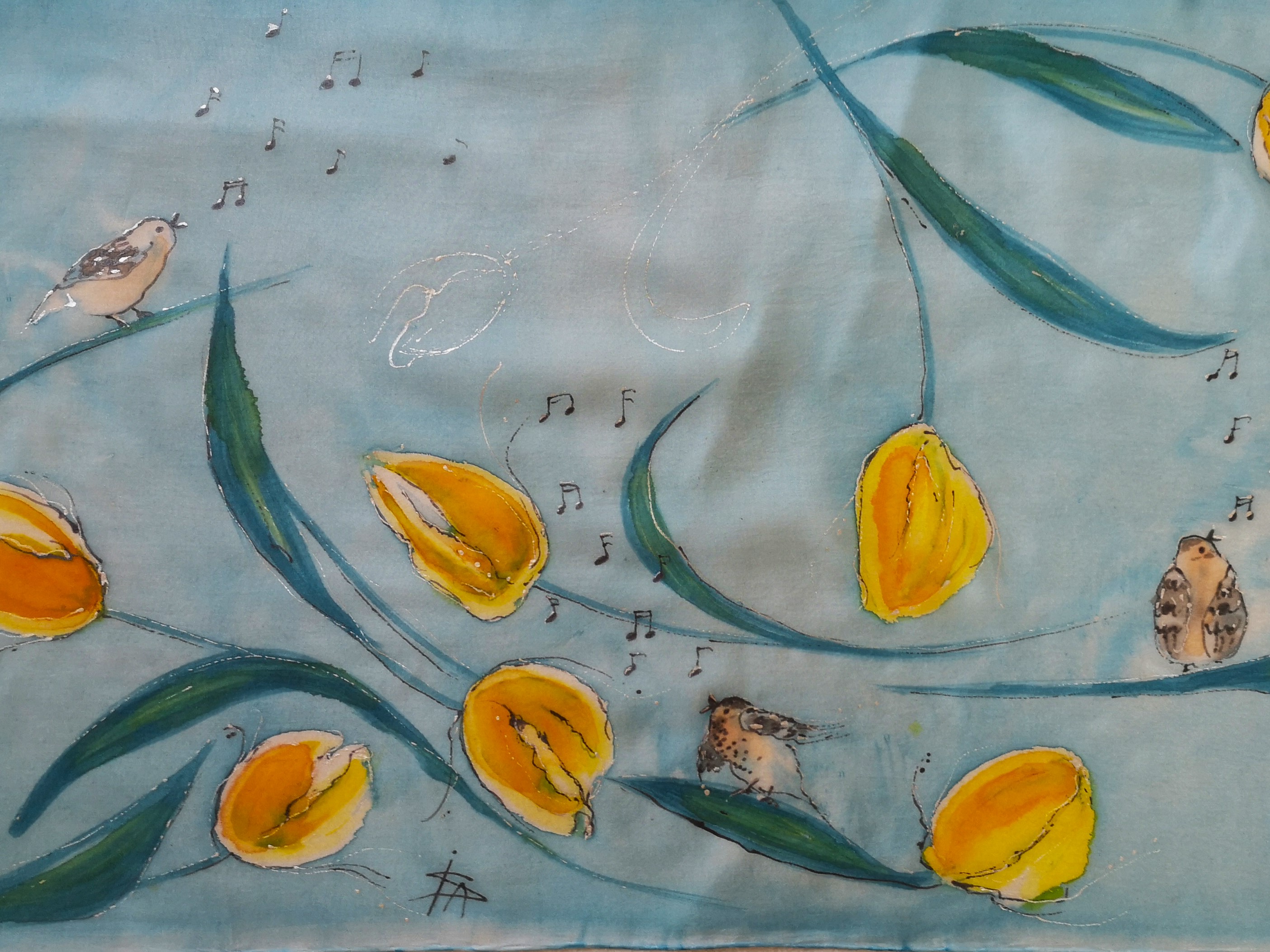 Ručně malovaná hedvábná šála. Akvarelová technika doplněná metalickou konturou. Jarní motiv se žlutými tulipány a ptáčky na blankytném pozadí.