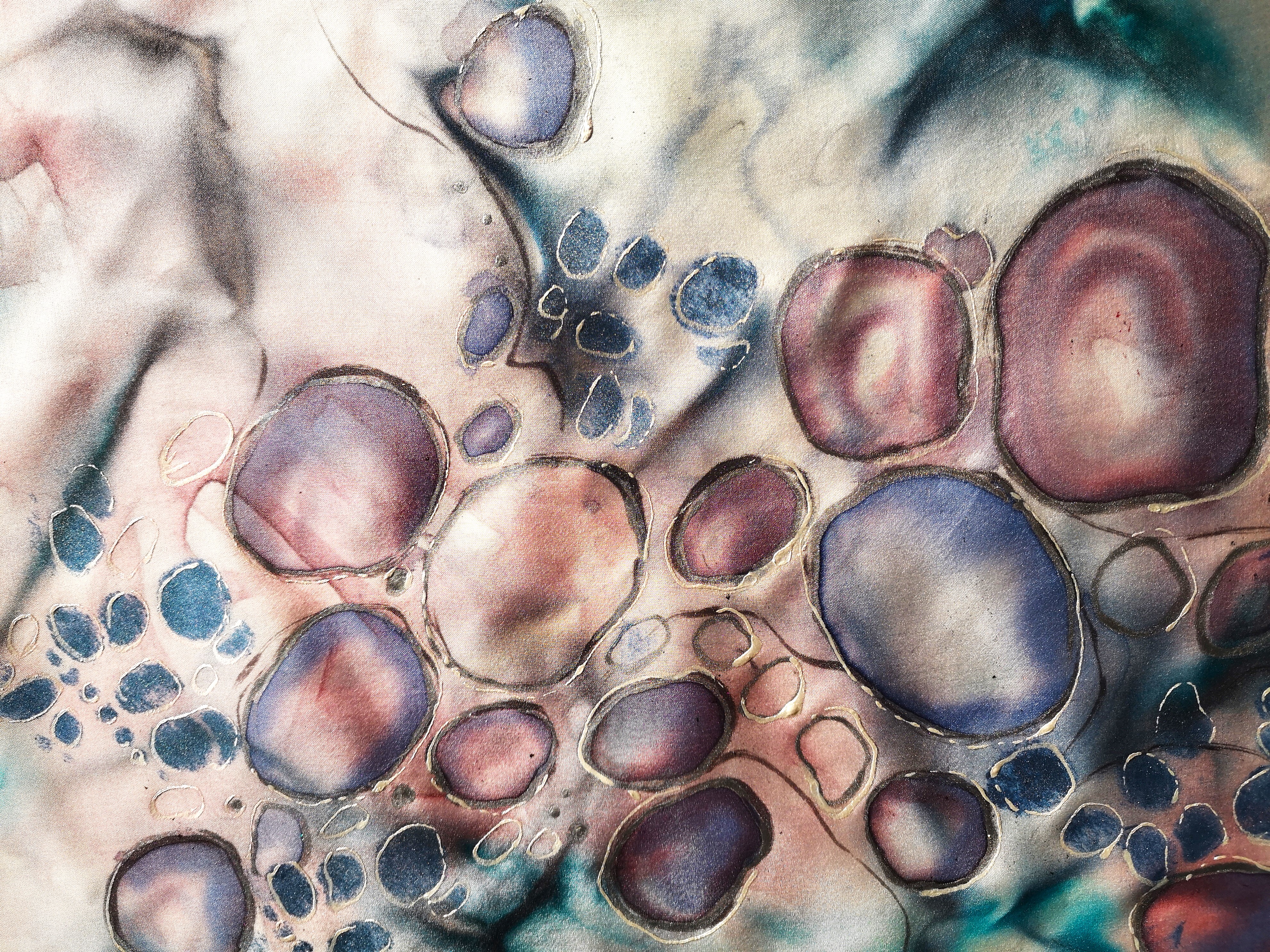 Jsou použity profesionální barvy na hedvábí Dye-na-flow od společnsoti Jacquard. Jsou zažehleny a při praní nepouštějí. Barvy jsou zažehleny a šála je vypraná. Můžete ihned nosit.