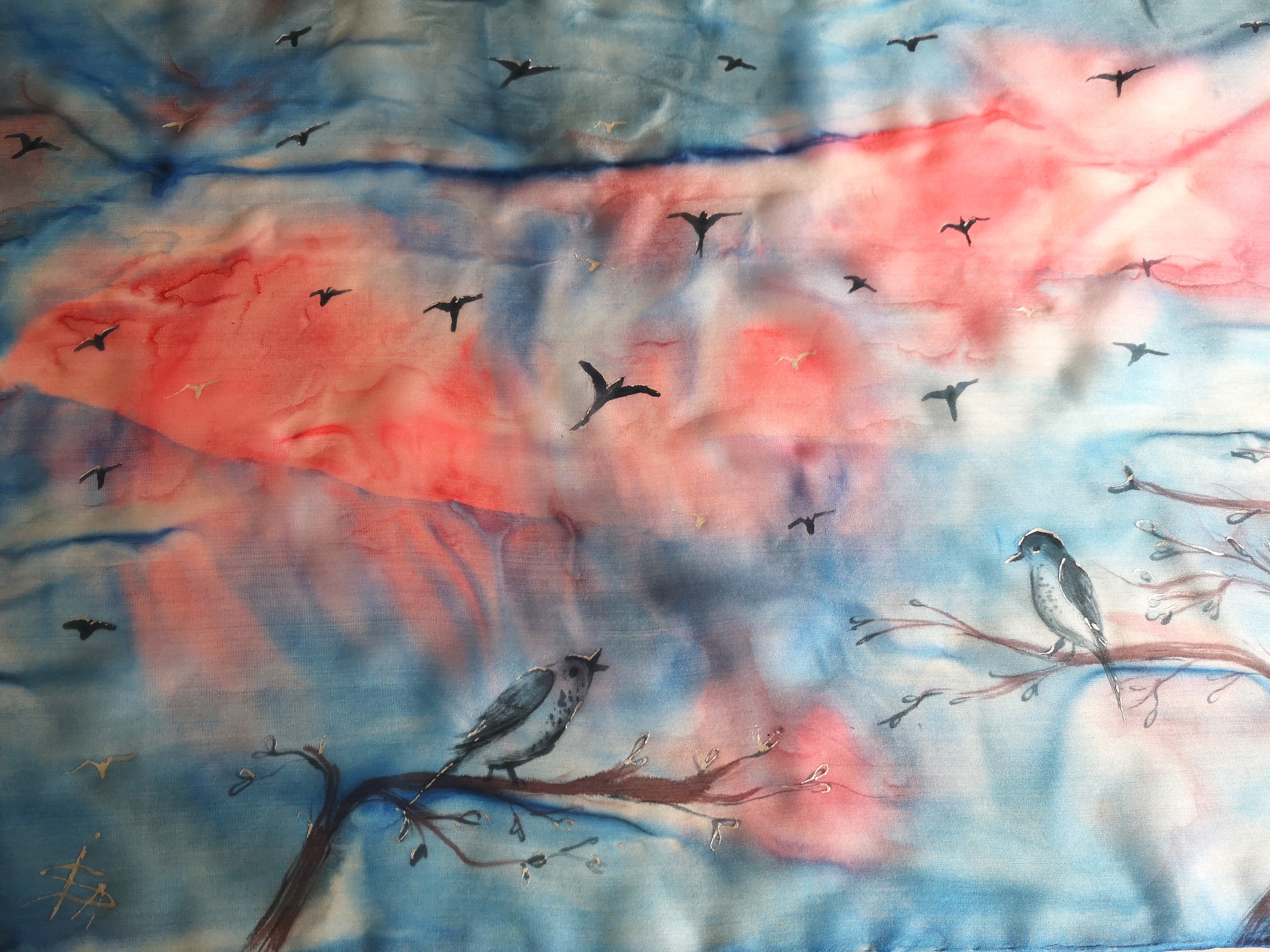Ručně barvená hedvábná šála z přírodního hedvábí. Akvarel barvách oblohy s červánky - světle modrá a lososově růžová. Ptáčci jso nakresleni tmavě modrou konturou s bílýmí detaily. Bílá kontura má perlový lesk, leskne se velmi jemně.