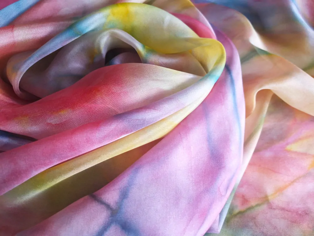 Ručně barvené pareo z pravého hedvábí. Jemné, sladké barvičky - světlounká magenta - lososová, zelená, žlutá a jejich přechody.