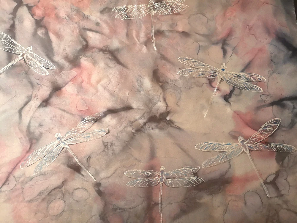 Originálně barvené pareo z pravého hedvábí. Decentní modrošedá a tlumená vínová s bílými vážkami. Kontura má perlový lesk.