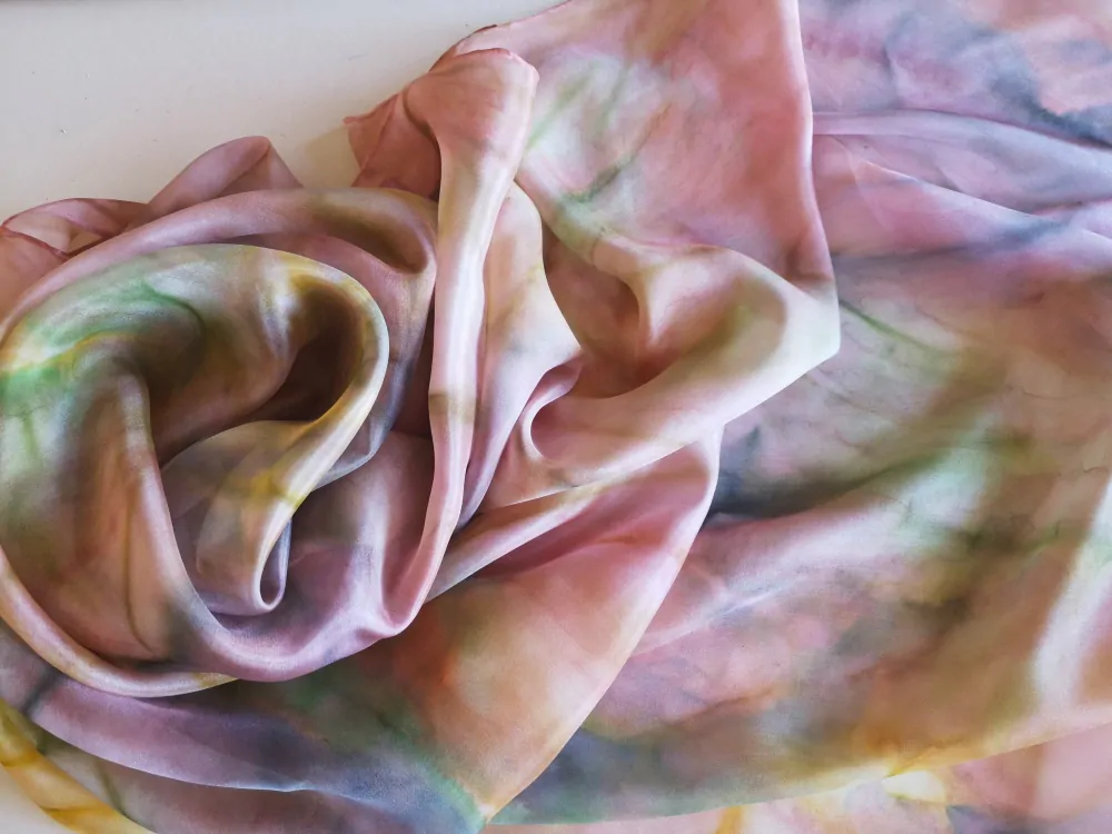 Ručně barvené pareo z pravého hedvábí. Jemné barvičky - světlounká broskvová - lososová, zelená, fialová, žlutá a jejich přechody.