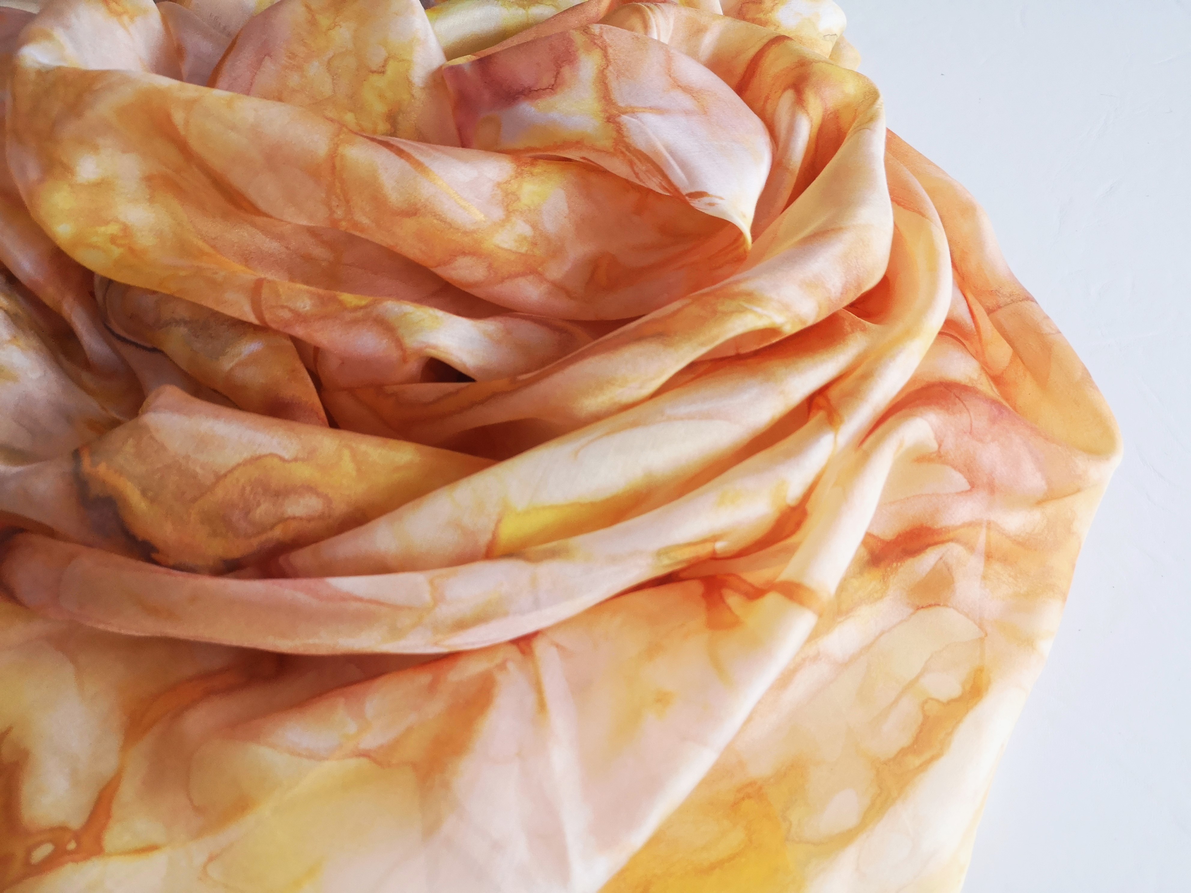 Originálně barvené pareo z pravého hedvábí. Mramorování v krásných, teplých barvách. Kresba připomíná mramor.