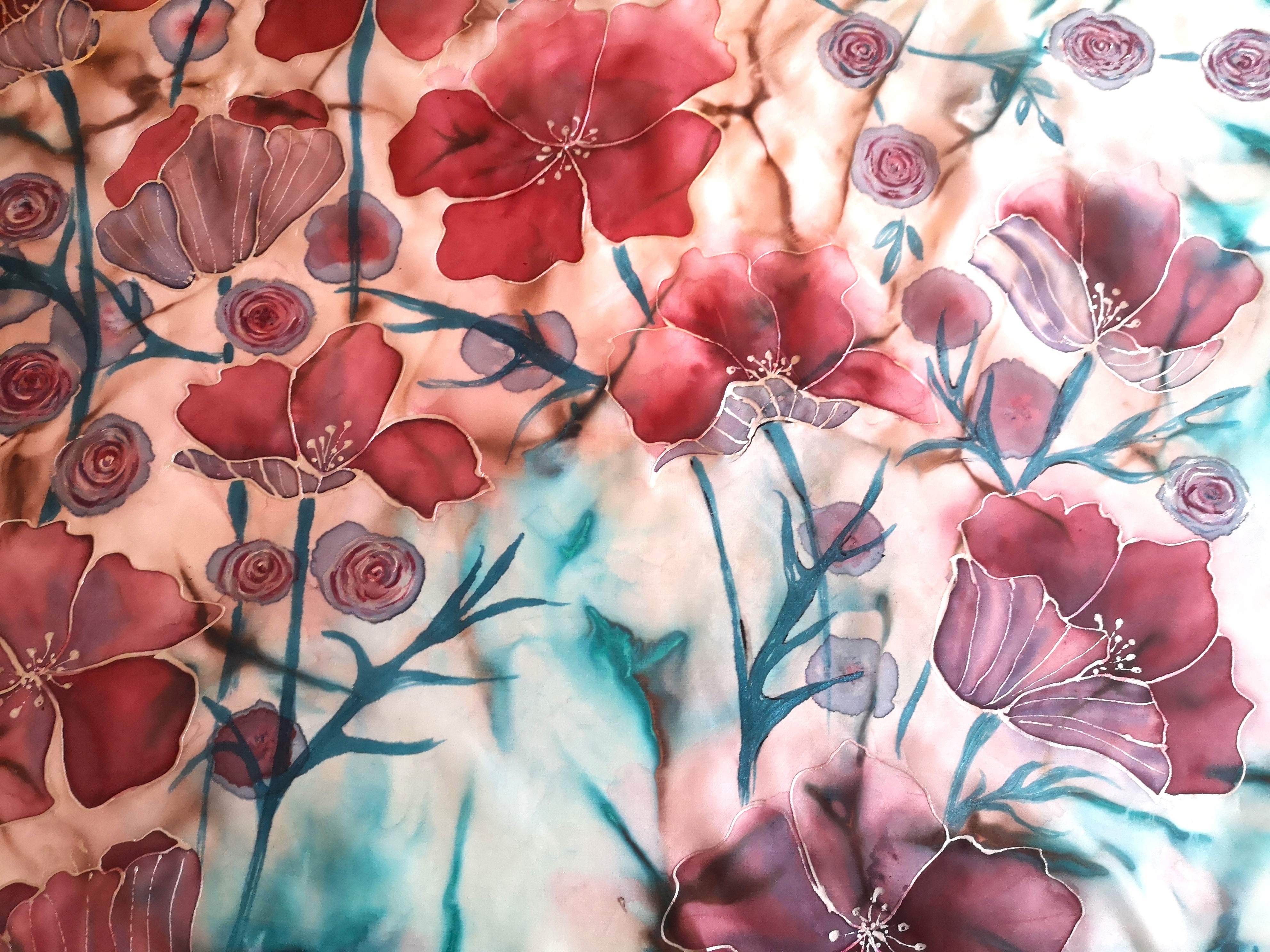 Jsou použity profesionální barvy na hedvábí Dye-na-flow od společnsoti Jacquard. Jsou zažehleny a při praní nepouštějí. Barvy jsou zažehleny a šála je vypraná. Můžete ihned nosit.