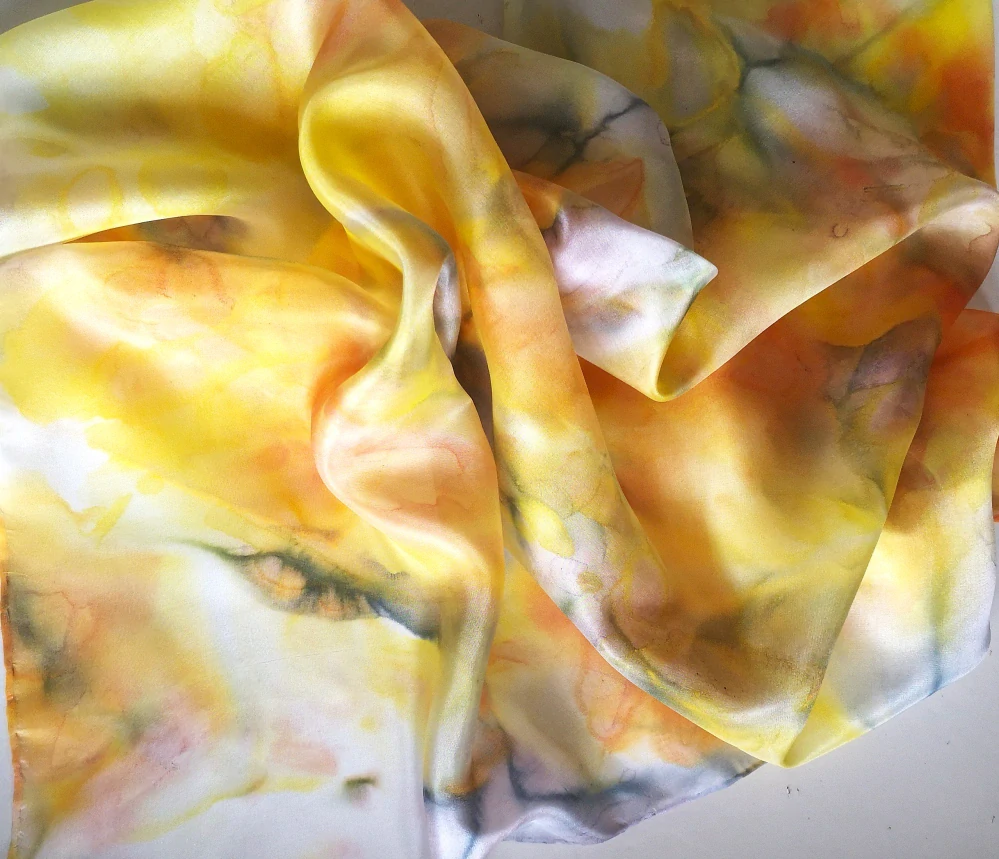 Jsou použity profesionální barvy na hedvábí Dye-na-flow od společnsoti Jacquard. Jsou zažehleny a při praní nepouštějí. Barvy jsou zažehleny a šála je vypraná. Můžete ihned nosit.