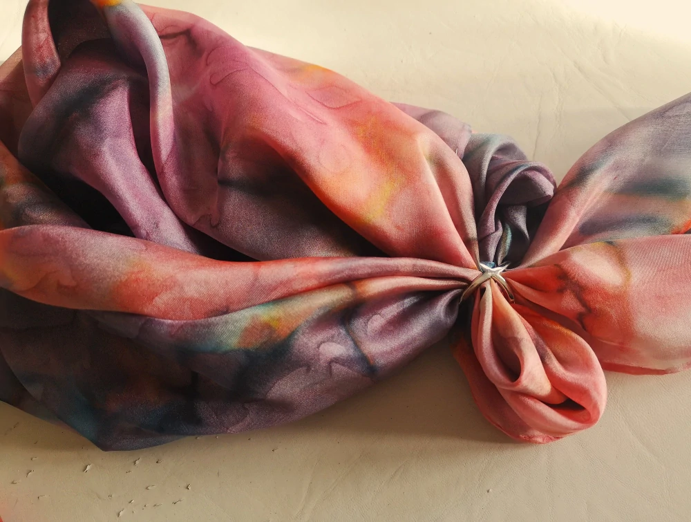 Ručně malované hedvábí. Velikost vhodná do rozhalené košile. Sponu přikládám k šátku jako dárek :-).