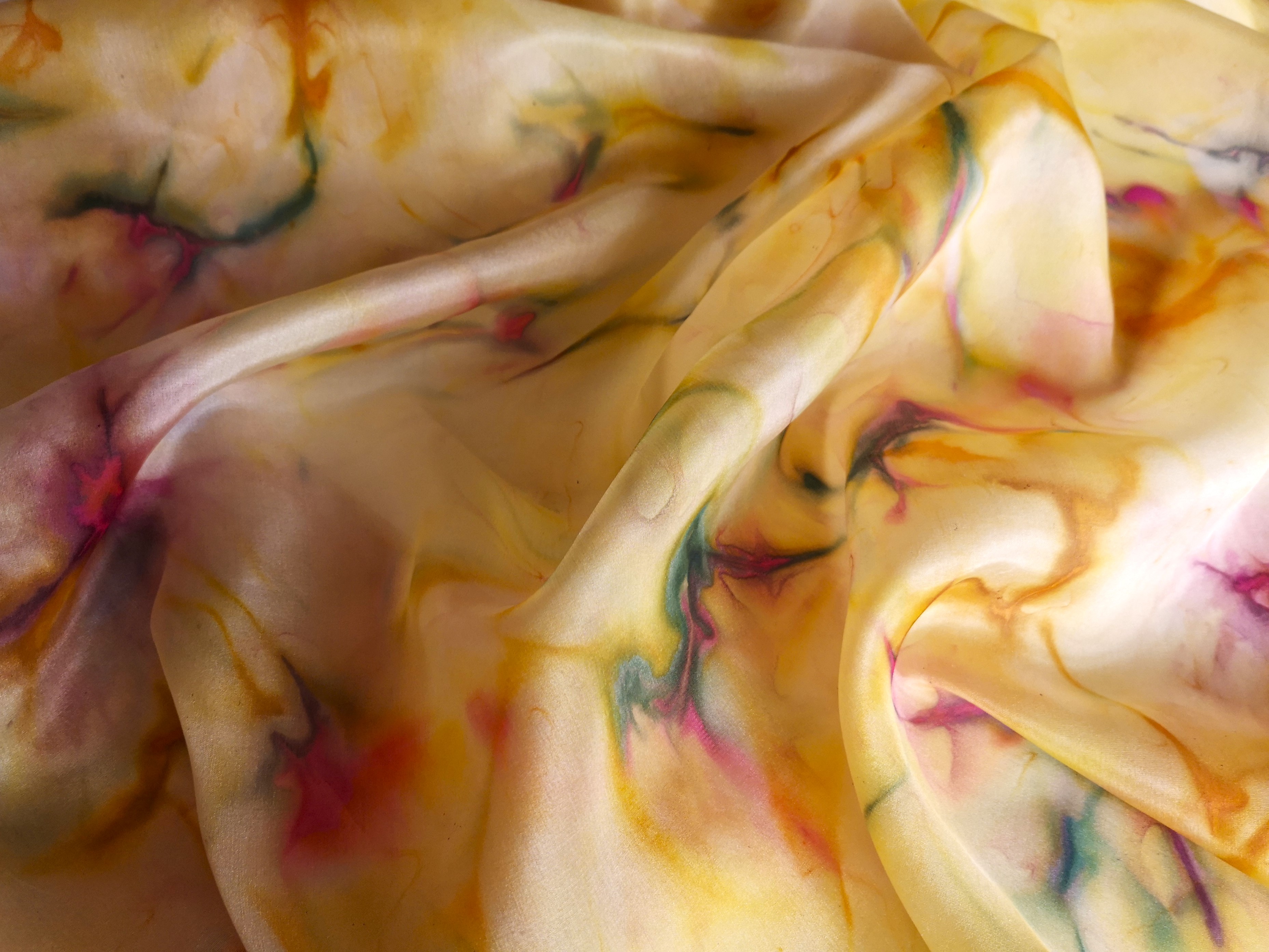 Ručně barvený šátek z přírodního hedvábí. Mramorování v krásných letních barvičkách s převládající žlutou. Nemůže chybět ani módní magenta. Luxusní šátek do košile, vhodný i pro muže.
