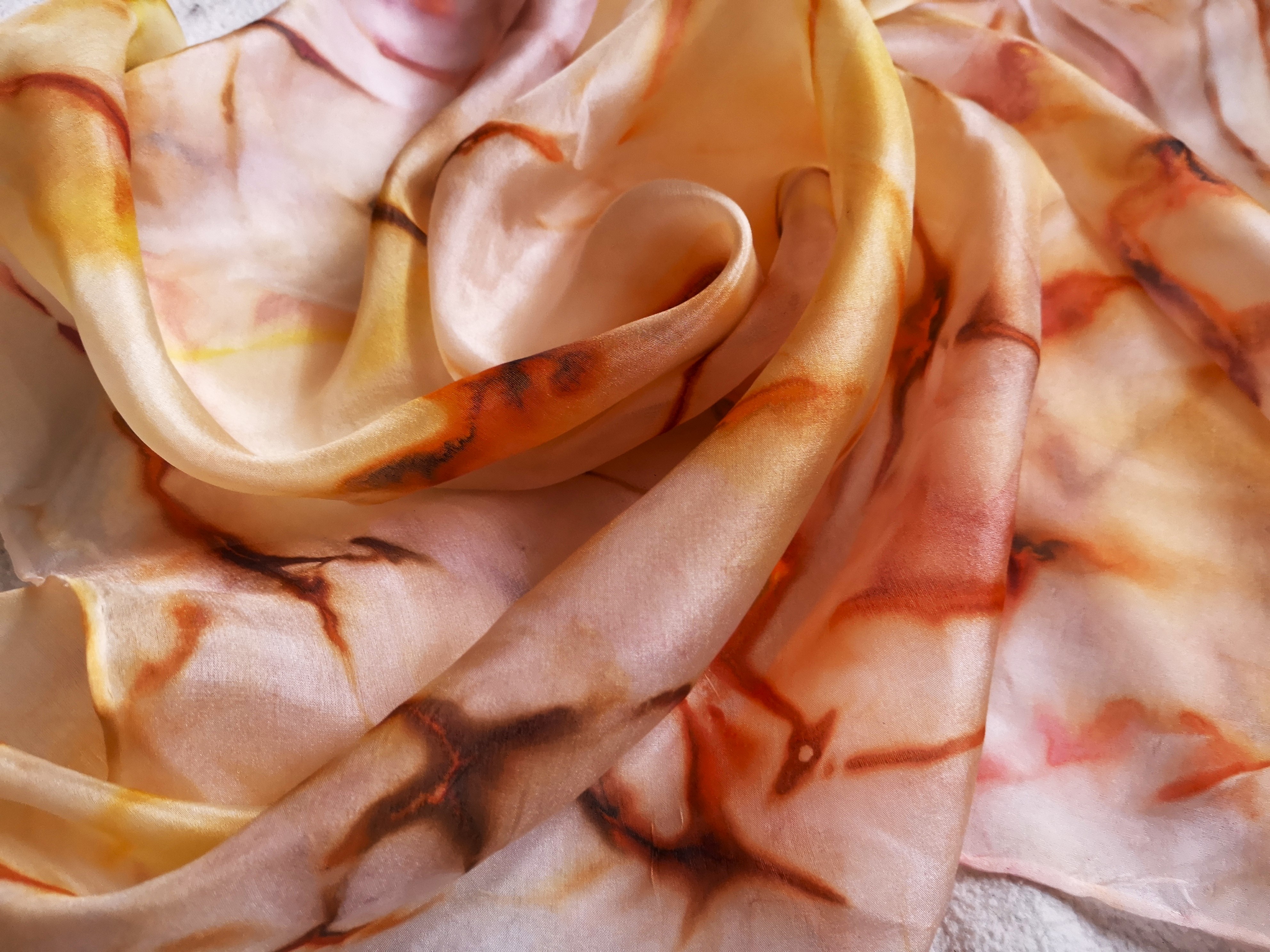 Ručně barvený šátek z přírodního hedvábí. Mramorování v krásných, jemných a teplých odstínech pro dobrou náladu. Rozjasní den i tvář.