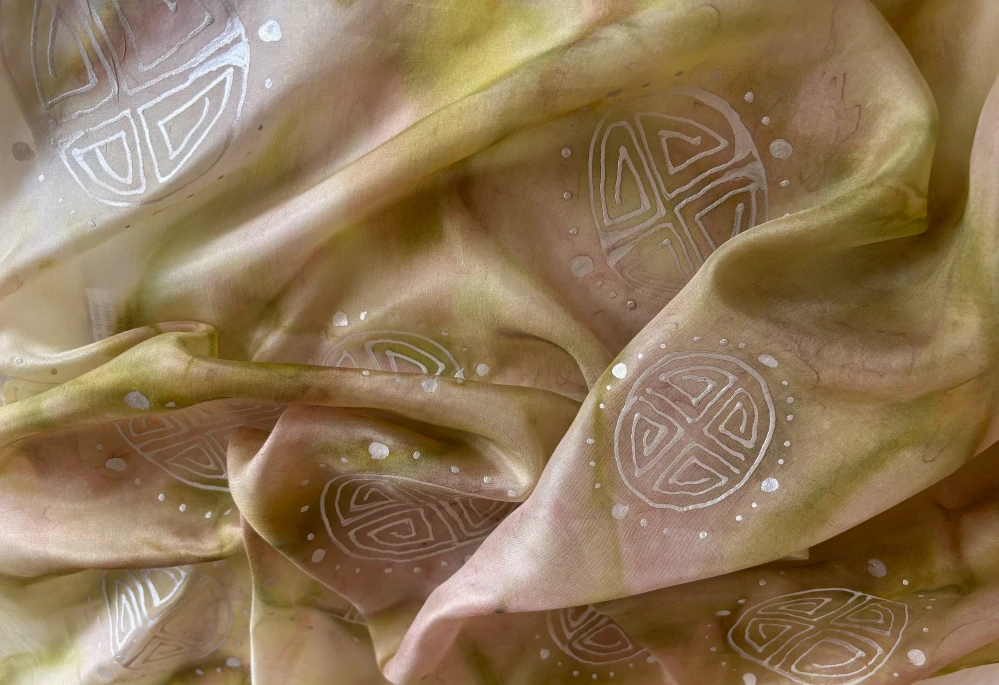 Ručně malovaný hedvábný šátek. Zemité zelenkavé a lososové tóny jsou doplněny ornamentální kresbou z volné ruky. Ornamenty mají lehký perlový lesk.