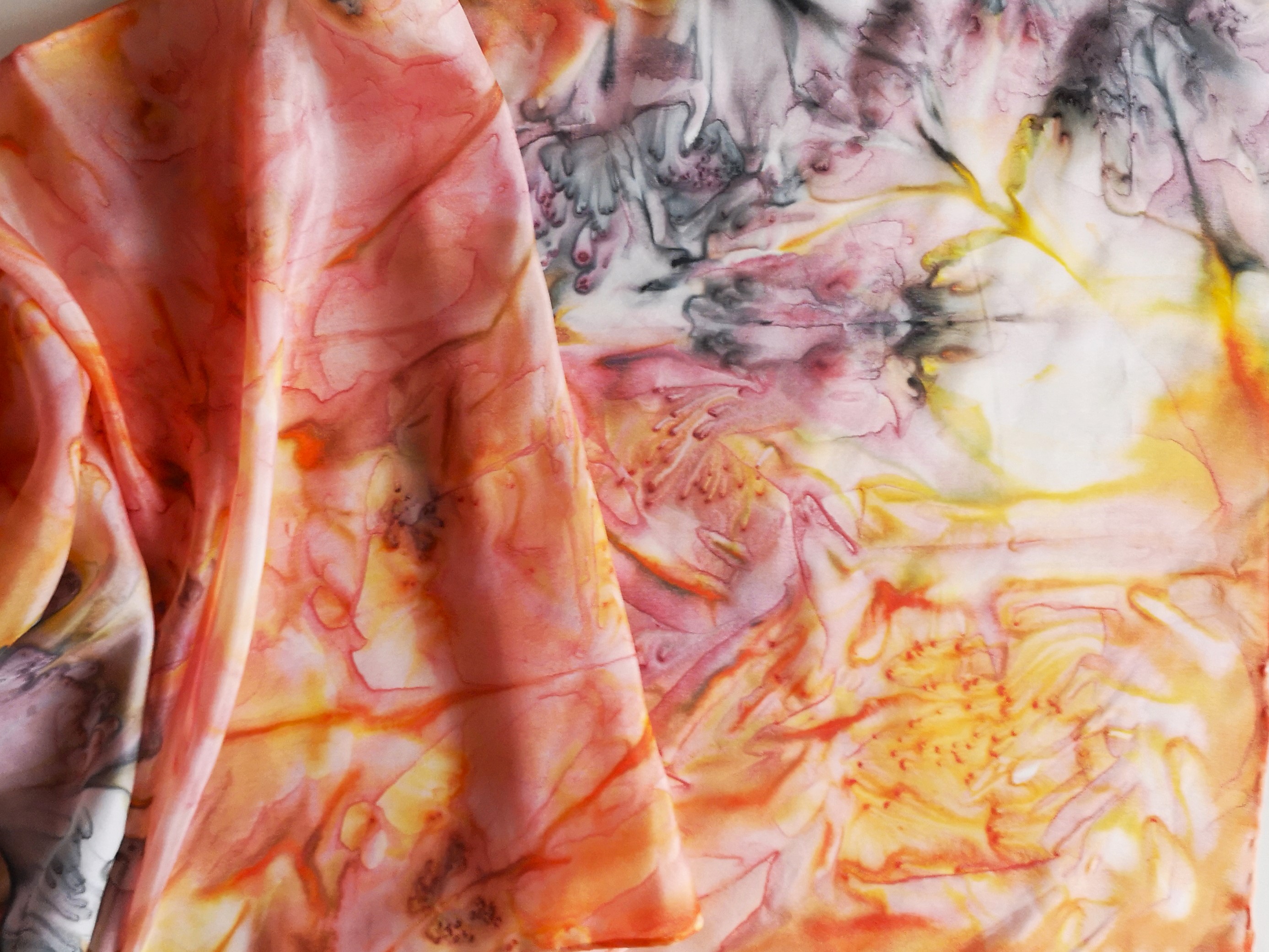 Jsou použity profesionální barvy na hedvábí Dye-na-flow od společnsoti Jacquard. Jsou zažehleny a při praní nepouštějí. Barvy jsou zažehleny a šála je vypraná. Můžete ihned nosit.