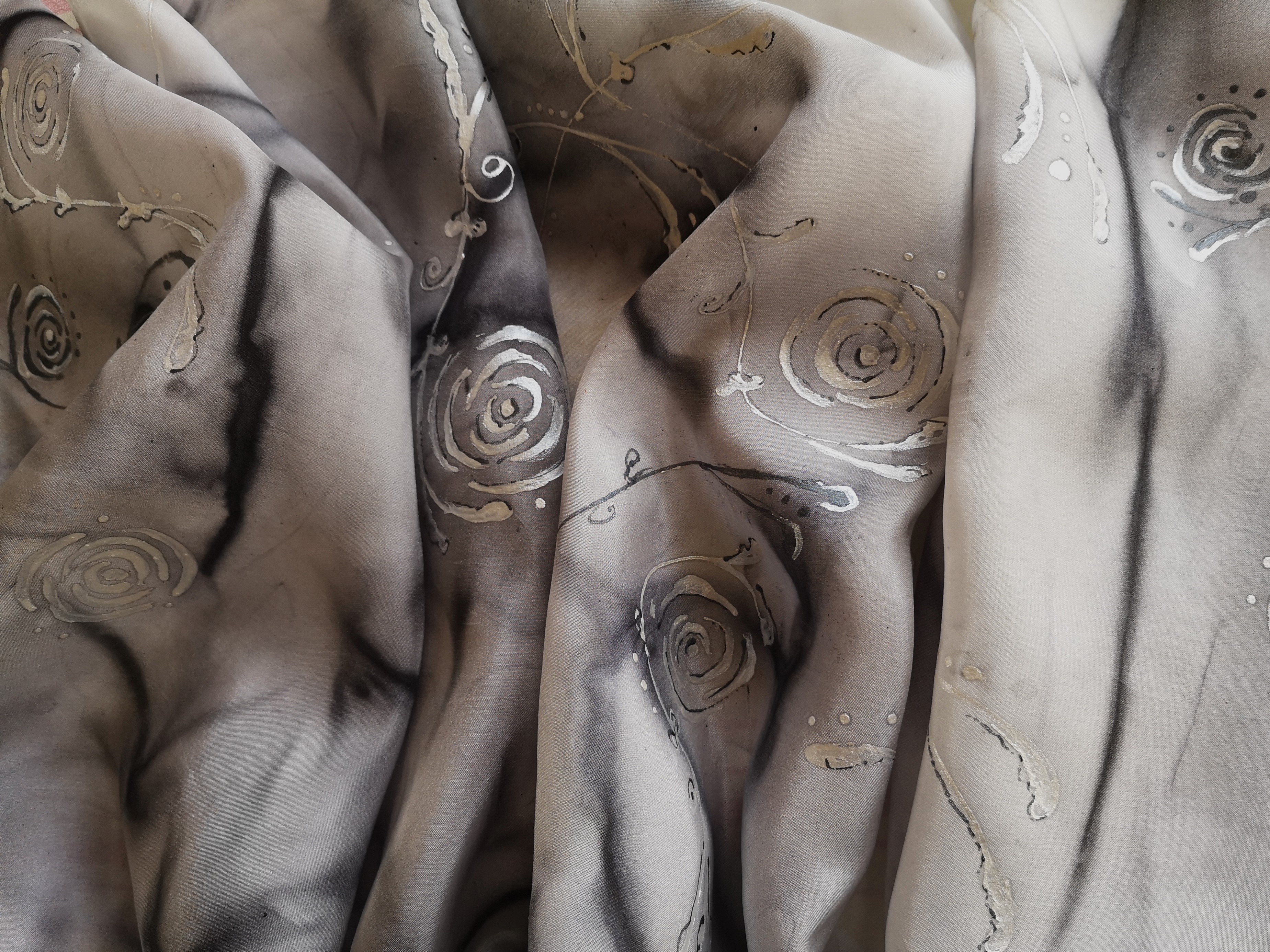 Ručně barvený hedvábný šál z luxusního typu hedvábí. Mramorování v šedých barvách, doplněno kresbou z volné ruky. Jemný ornament je nakreslen bílou konturou s perlovým leskem.
