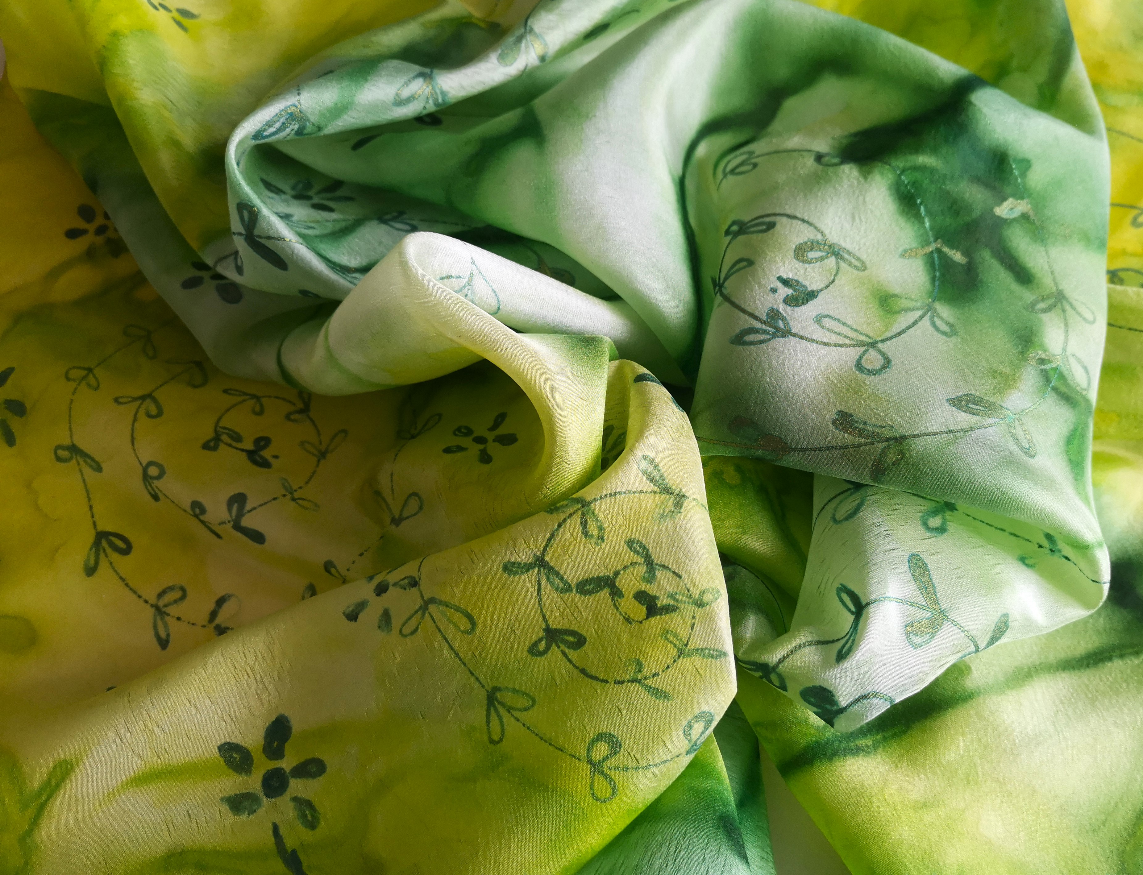 Ručně barvený hedvábný šál z přírodního hedvábí. Mramorování v limetkovo zelenkavých barvách doplněno kresbou z volné ruky. Jemný ornament je nakreslen zeleno zlatou konturou s perlovým leskem.
