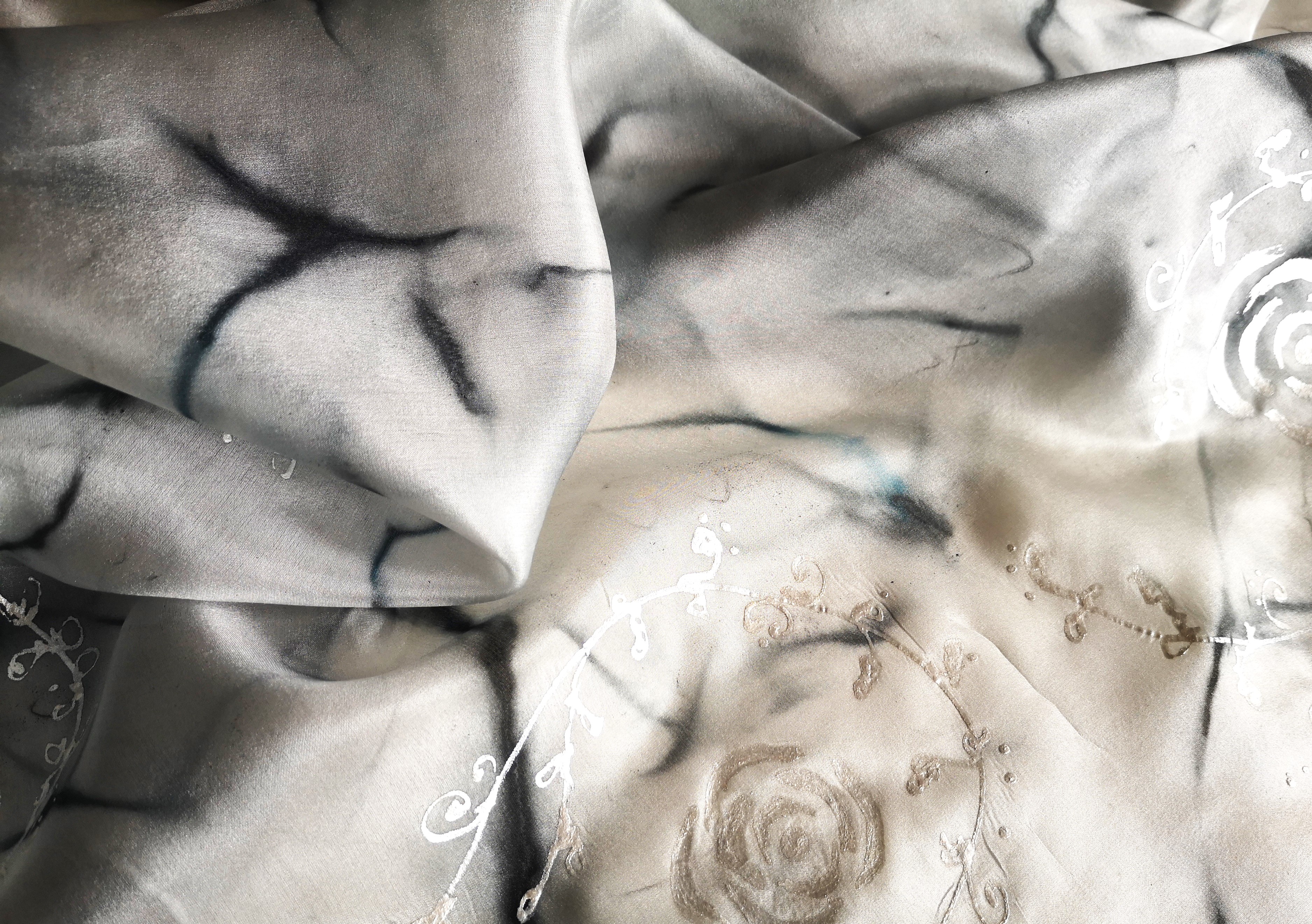 Ručně barvený hedvábný šátek z přírodního hedvábí. Mramorování v šedých barvách s modrošedým nádechem, doplněno kresbou z volné ruky. Jemný ornament je nakreslen bílou konturou s perlovým leskem.