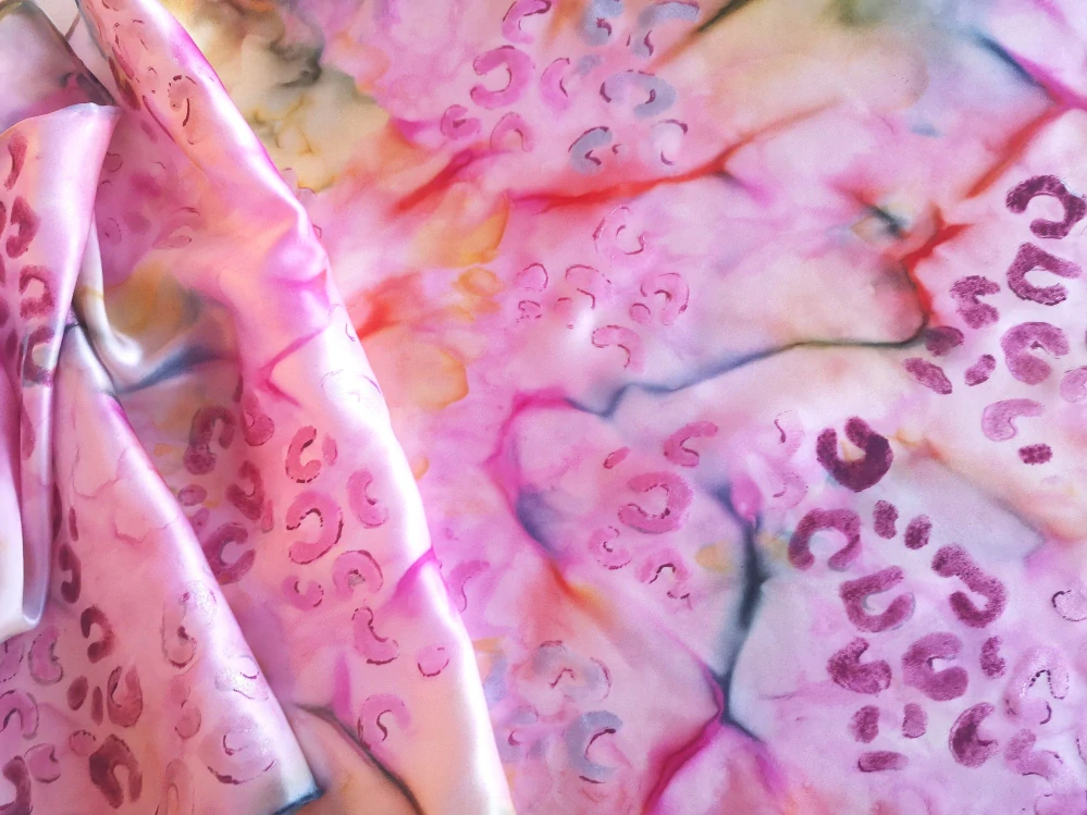 Barvy na šátku: vínová, růžová, žlutá, smagdová a jejich přechody. Leopardí vzor je malován vínovou barvou se sametovou texturou a růžovou a bílou barvou s jemným metalickým leskem.