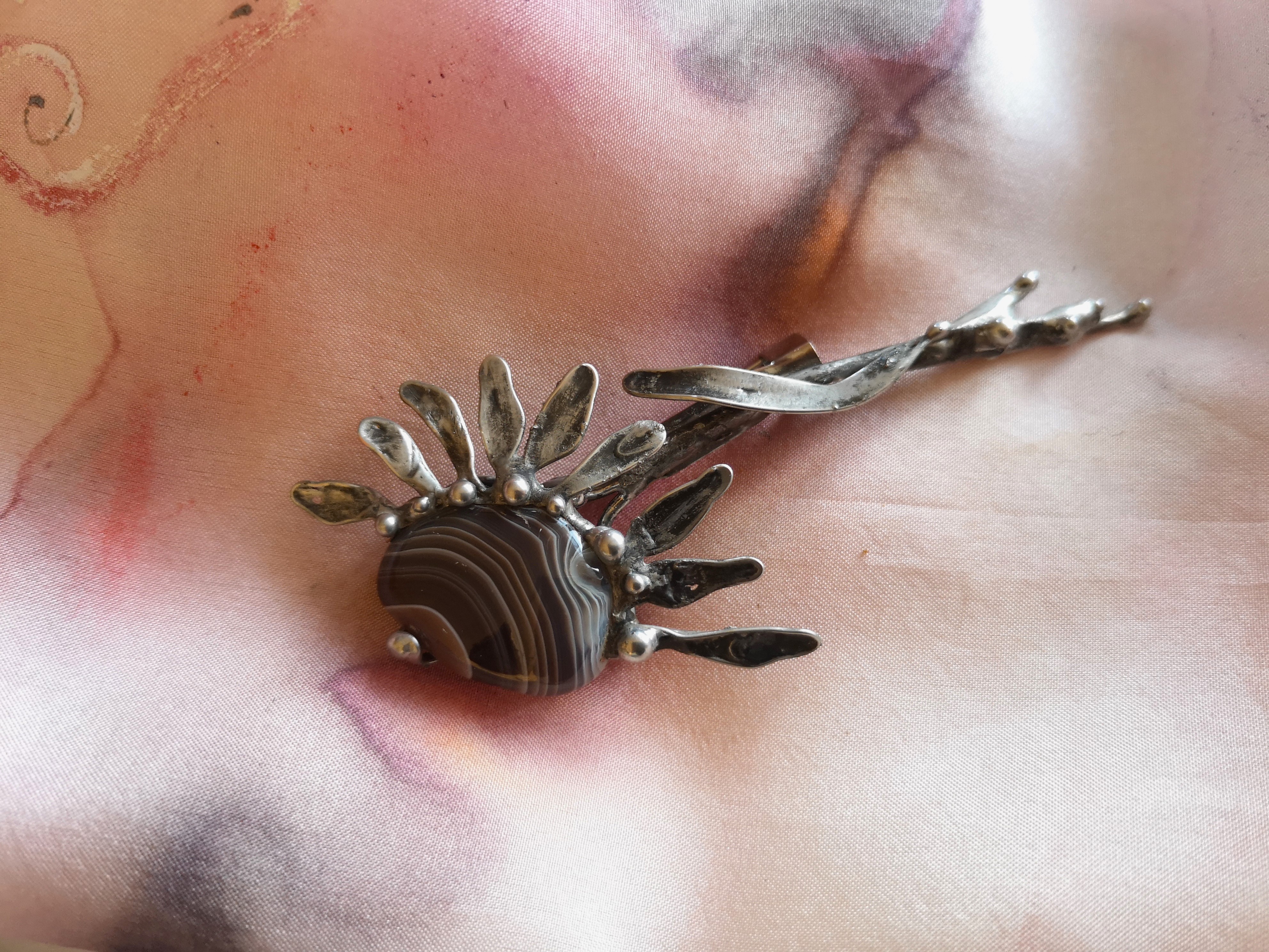 Cínovaný šperk s achátem. Cínováno, patinováno, leštěno. Zapínání na obvyklý brožový můstek.