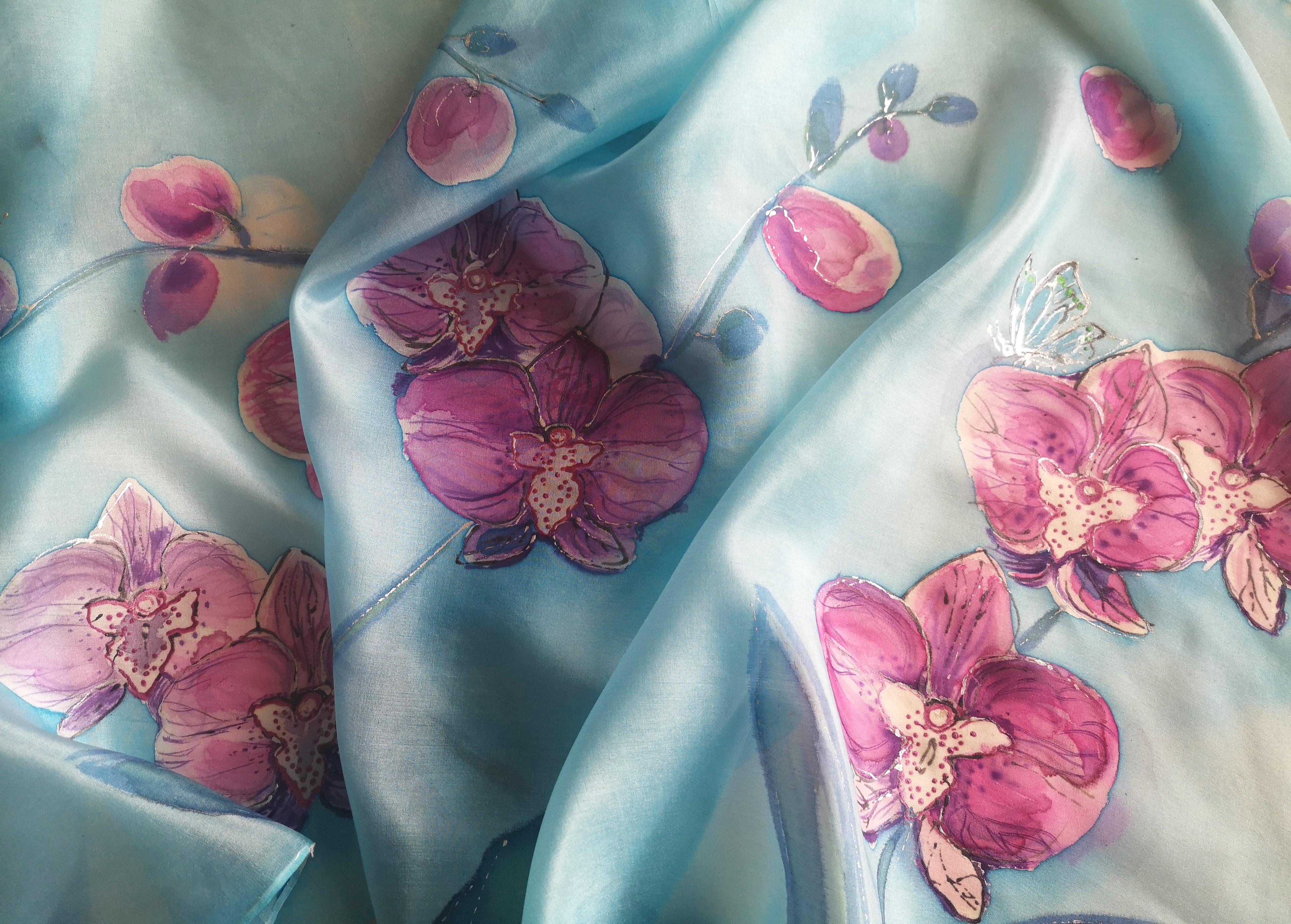 Ručně malovaná hedvábná šála. Akvarelová technika doplněná metalickou konturou. Šála je lehoučká s krásným leskem v jemných odstínech. Jemné květy orchidejí s motýlky - kresba z volné ruky. Bílá kontura s perlovým leskem dodává slavnostní ráz.