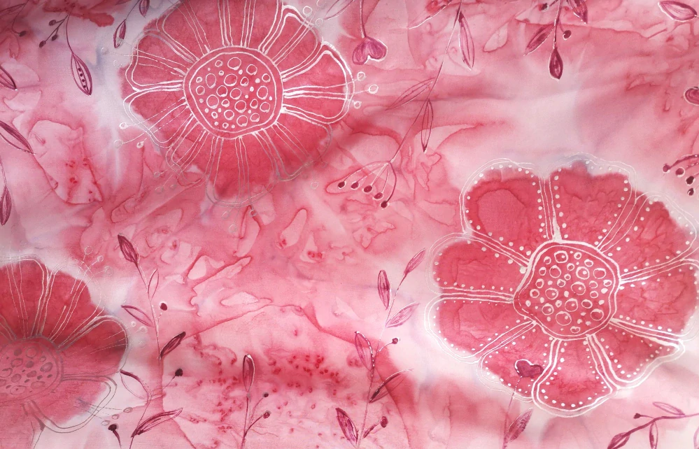 Ručně malovaný šál z přírodního hedvábí. Akvarelová technika v červené barvě. Kresba z volné ruky je nakreslena bílou konturou s perlovým leskem.