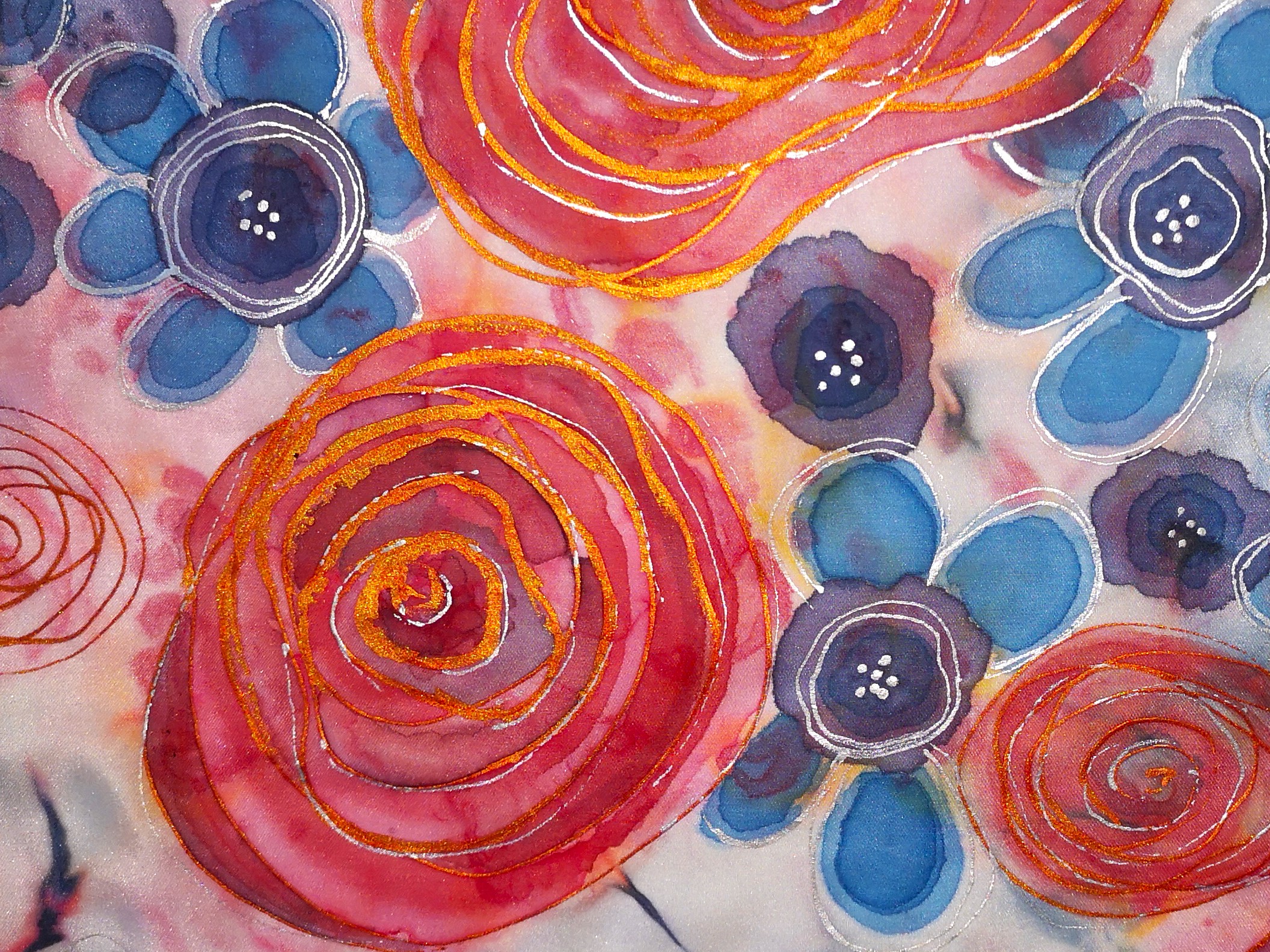 Hedvábný šál z luxusního typu hedvábí Habotai 8. Tak trochu fauvistická. Pestré barvy a veselý květinový motiv - barva je hlavním motivem pro vyjádření pocitů.